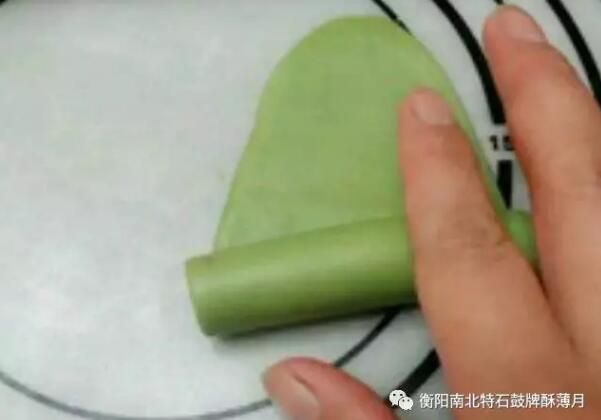 9.將油酥卷的兩頭向內壓,按扁搟成圓型